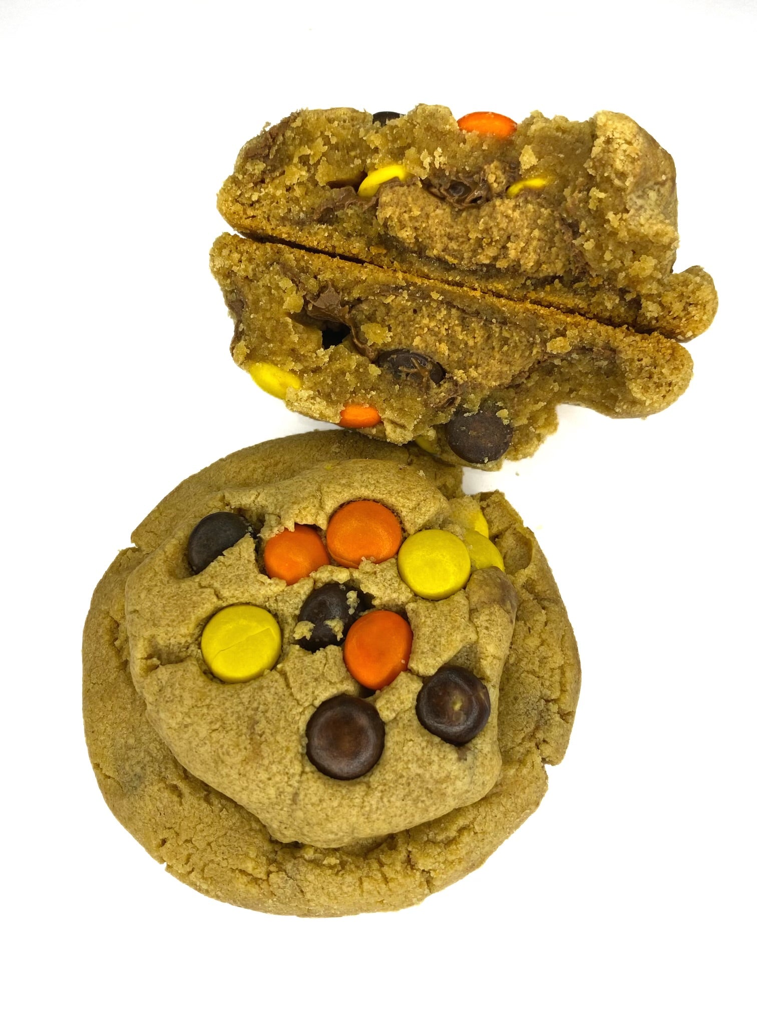 A giant peanut butter cookie packed with Reese’s pieces and cups, filled with a whole Reese’s cup, and topped with even more Reese’s pieces.